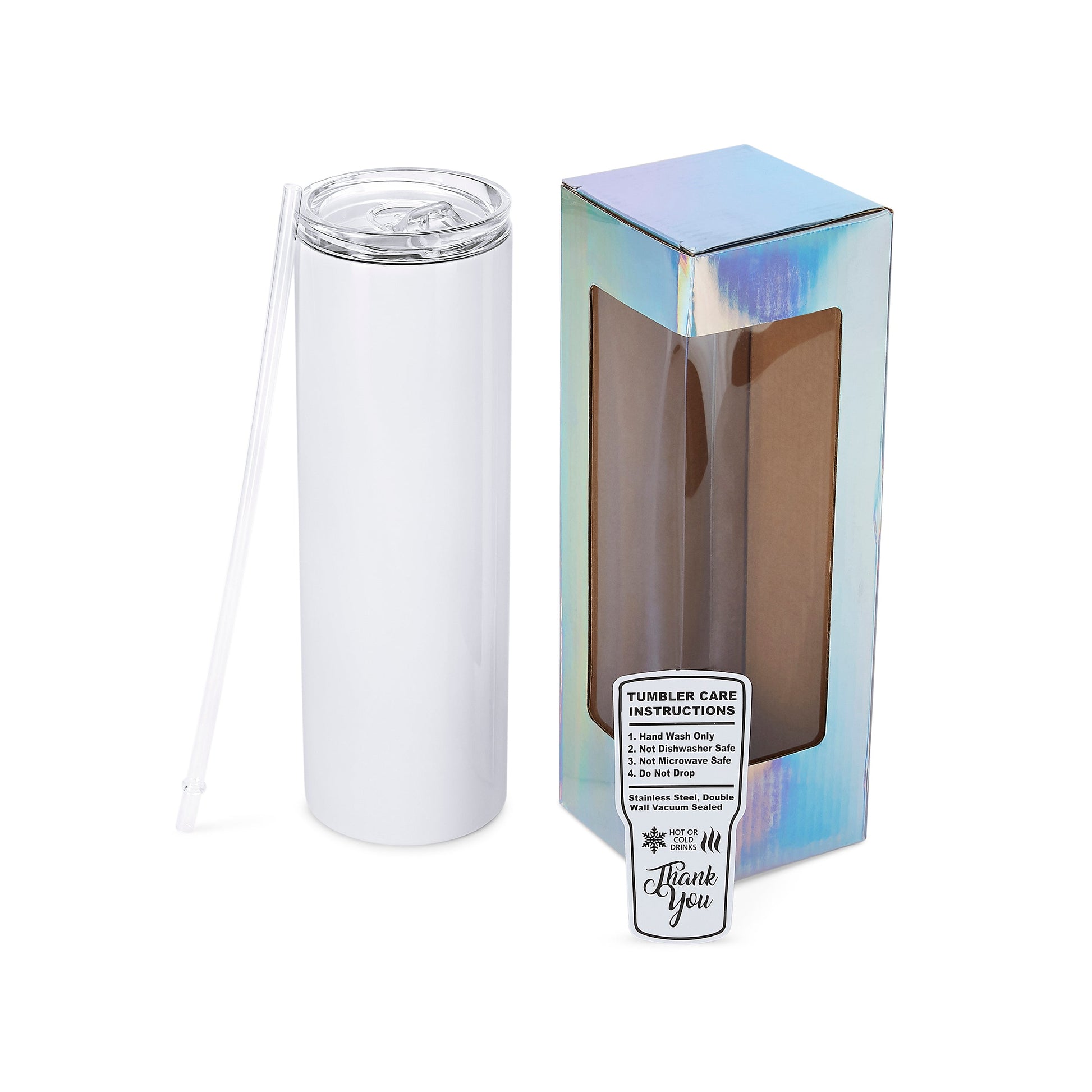 Thirsty? Quench your needs with this 30oz Skinny Tumbler, perfect for holding your favorite beverage! It's as slim and sleek as can be, so you can take it with you wherever your day takes you. Cheers to stylish hydration on the go! Comes with a beautiful gift box, straw and care card! 25 units come per case. Coated for sublimation, meaning you can make it your own with custom designs. Now that's brewing with possibilities!